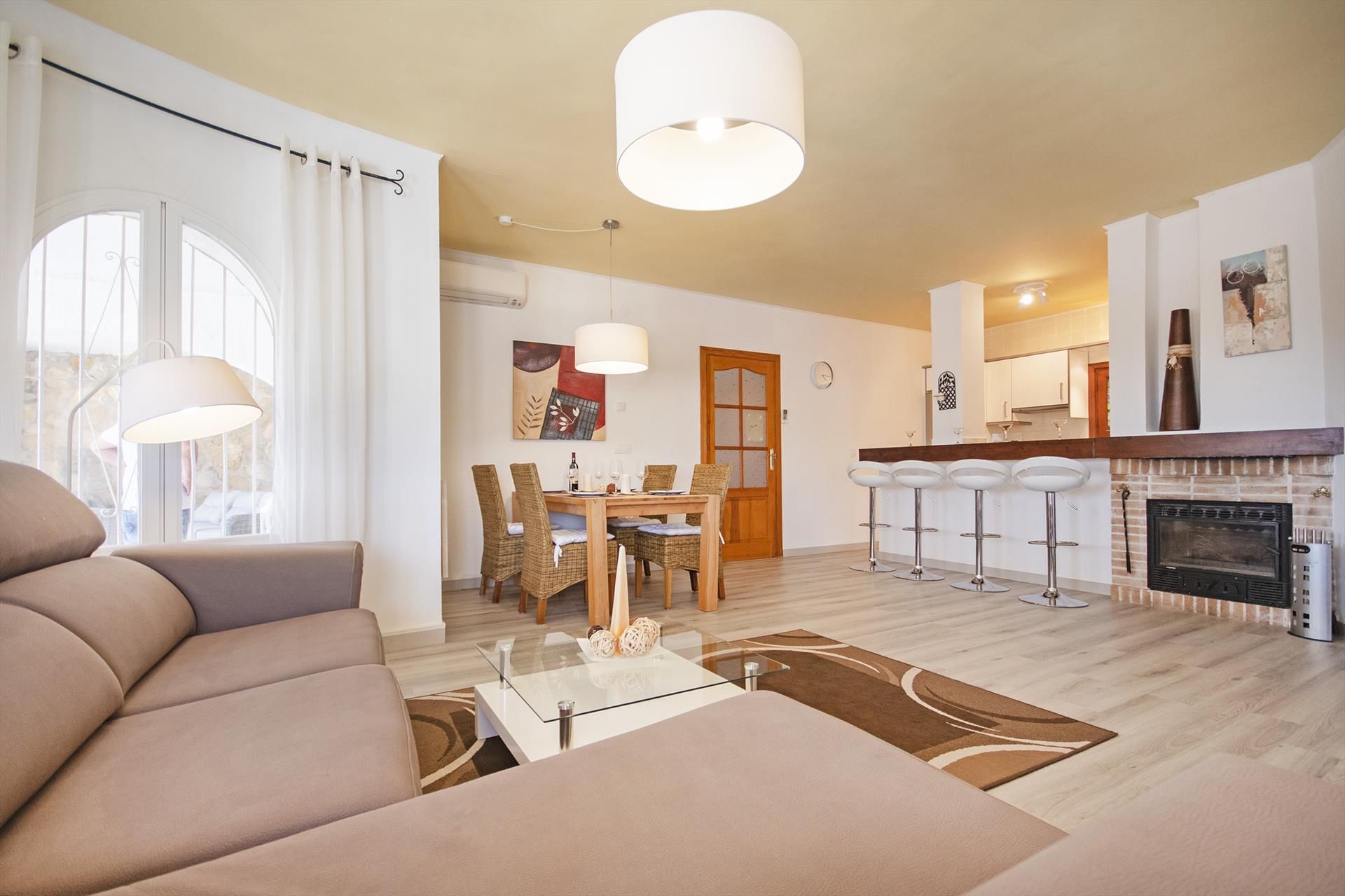 La casa cuenta con 2 dormitorios y 2 baños. El alojamiento ofrece un jardín con grava y árboles, una hermosa piscina y vistas impresionantes al mar y a las montañas. Su comodidad y la proximidad a la playa, áreas comerciales, actividades deportivas, vida nocturna, lugares de interés y cultura hacen de esta villa un lugar ideal para pasar sus vacaciones en España con familia o amigos.