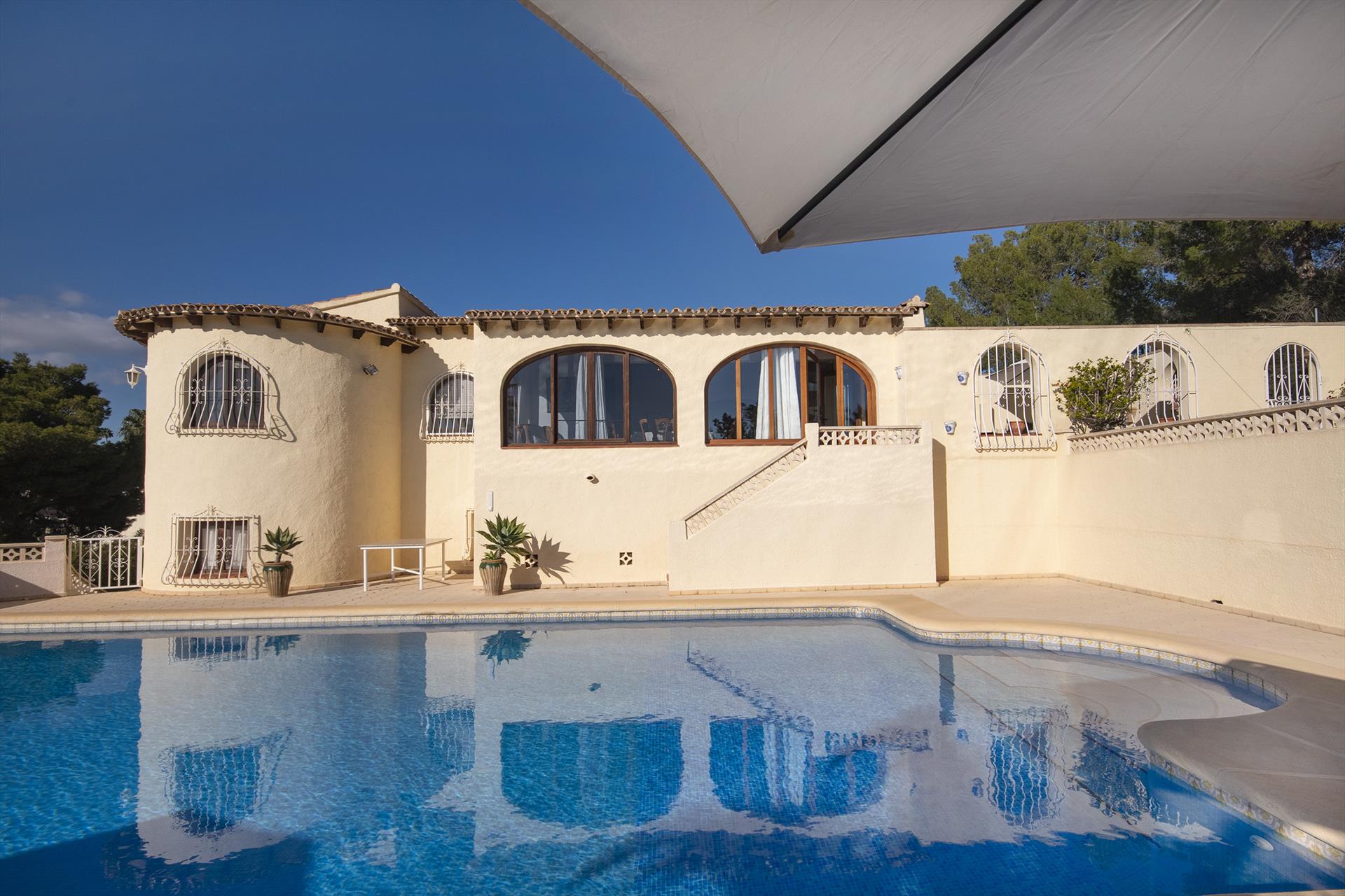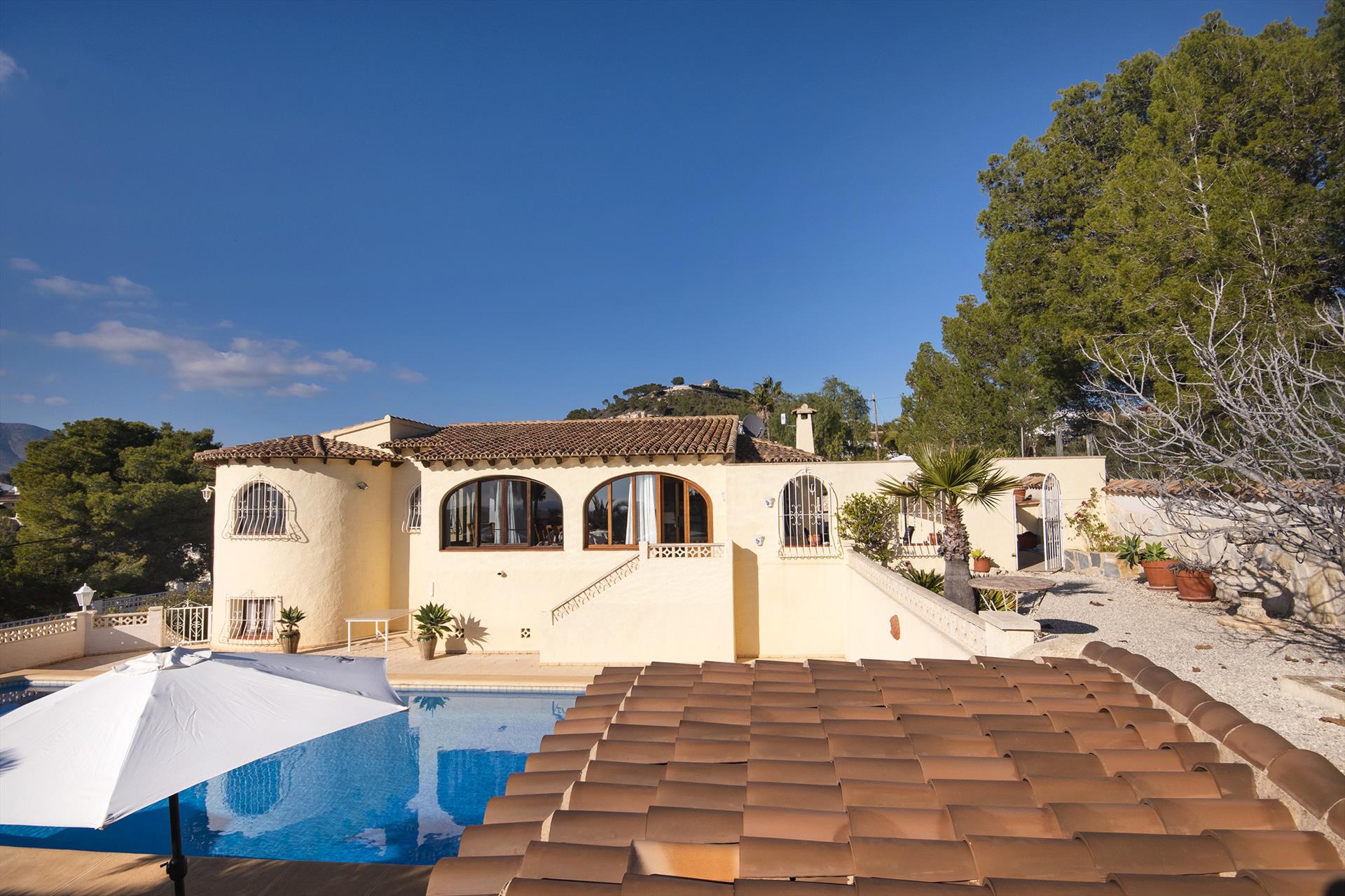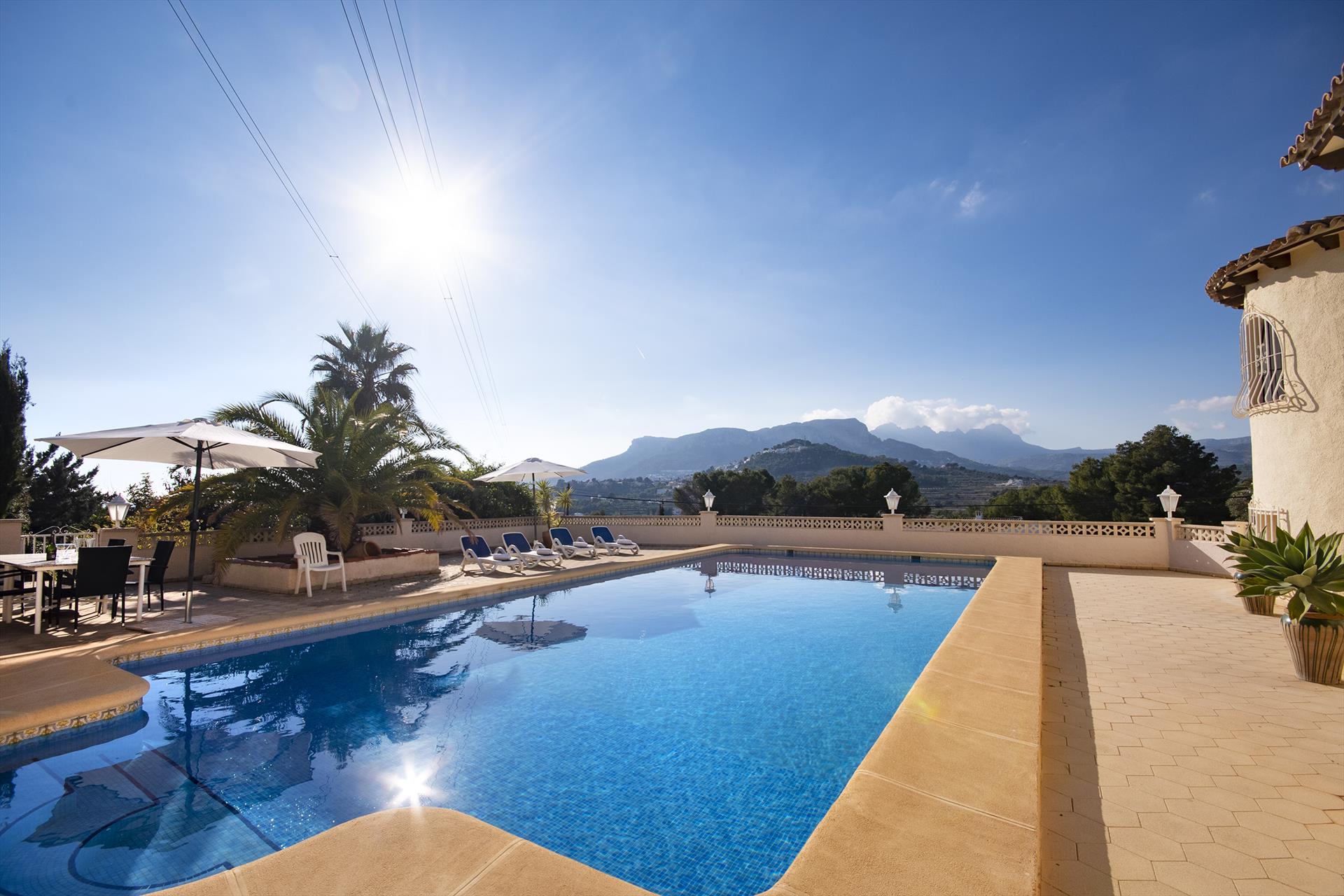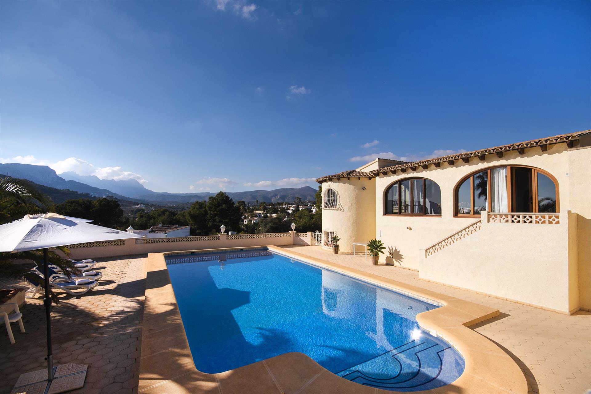 Amplia y encantadora villa con piscina privada en Calpe, Costa Blanca, España, para 6 personas. La casa está situada en una zona costera, montañosa y residencial.