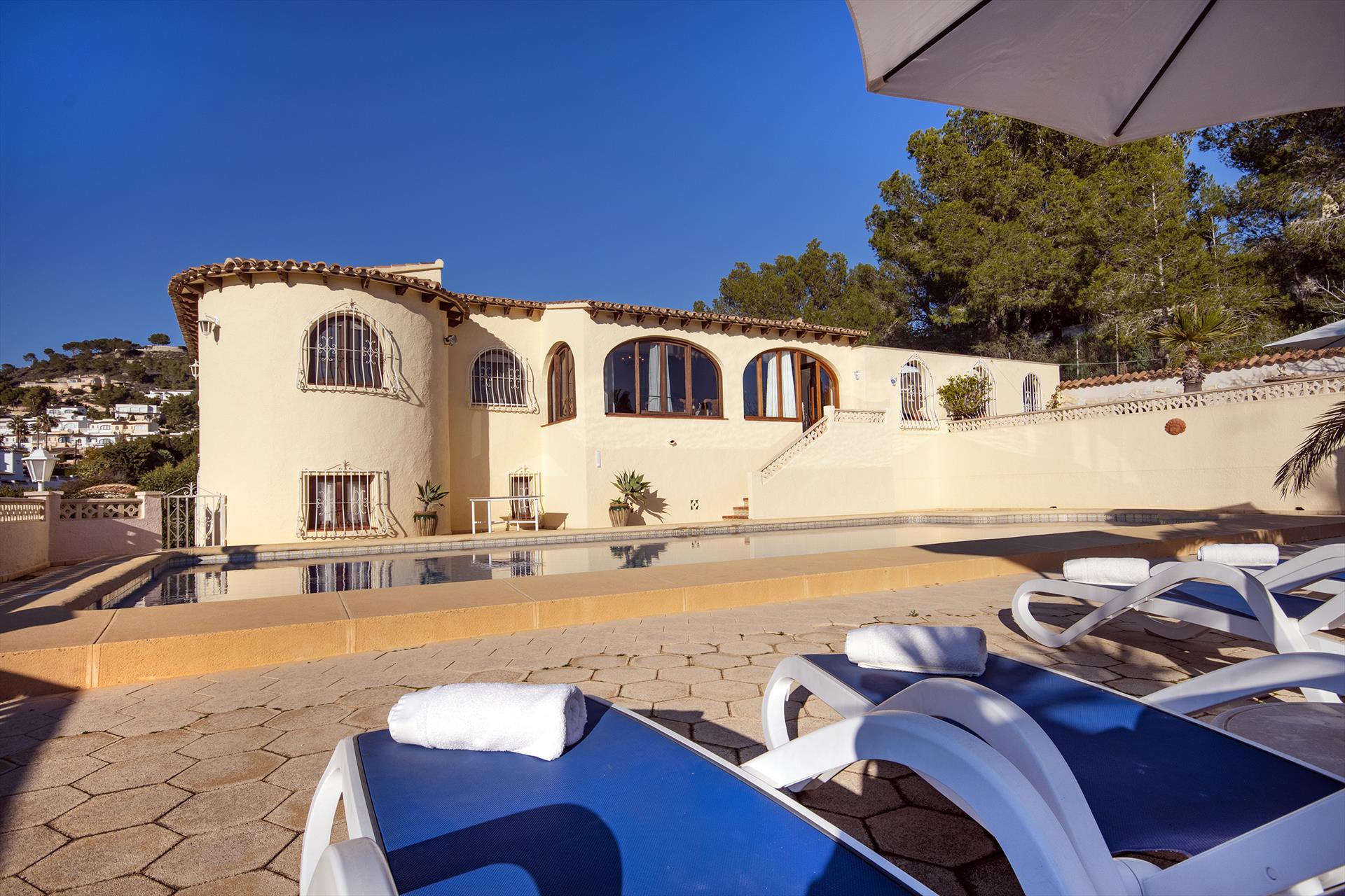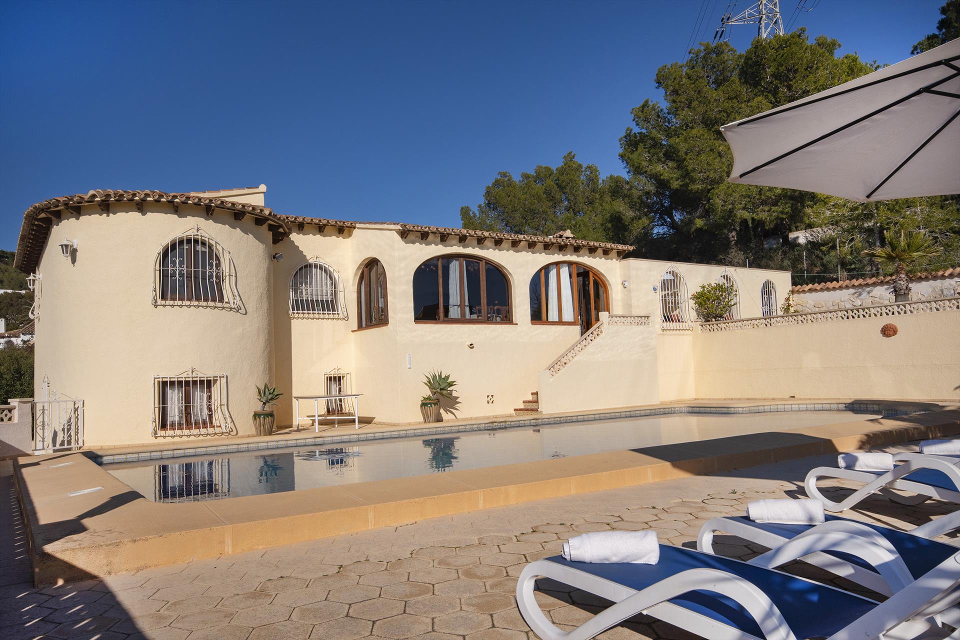 La casa cuenta con 3 dormitorios y 2 baños. El alojamiento ofrece privacidad, un jardín con árboles, una maravillosa piscina grande, impresionantes vistas al mar y hermosas vistas a las montañas y al pueblo. Su comodidad y la proximidad a la playa, actividades deportivas, instalaciones de entretenimiento, lugares de interés y cultura hacen de esta villa un lugar ideal para pasar sus vacaciones en España con familia o amigos.