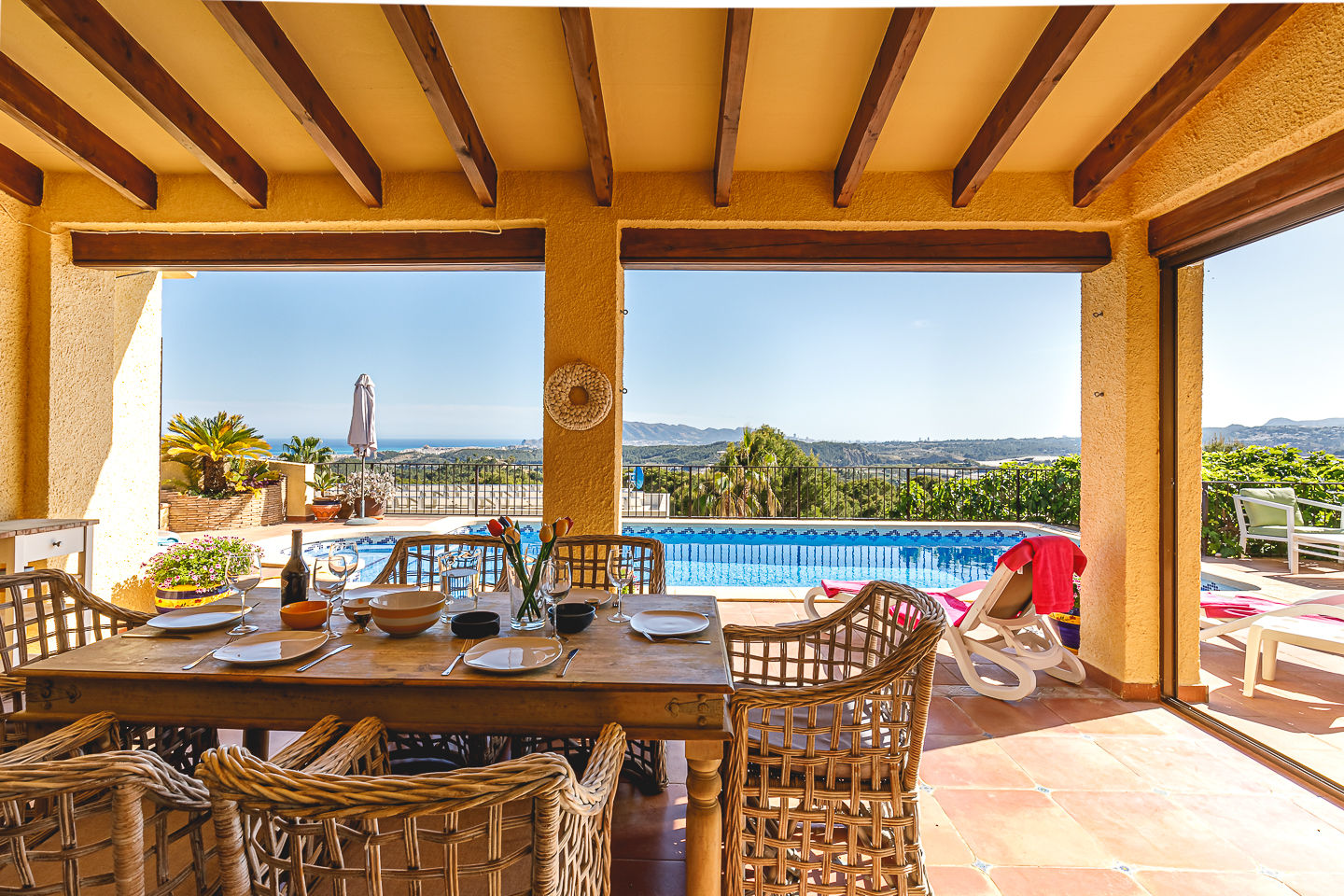 La casa cuenta con 3 dormitorios y 2 baños. El alojamiento ofrece mucha privacidad, un jardín con árboles, una hermosa piscina climatizada, maravillosas vistas de la bahía, así como espléndidas vistas del mar, el valle, el campo y las montañas. La cercanía a actividades deportivas convierte esta casa en un excelente lugar para disfrutar de unas vacaciones en España con familiares o amigos.