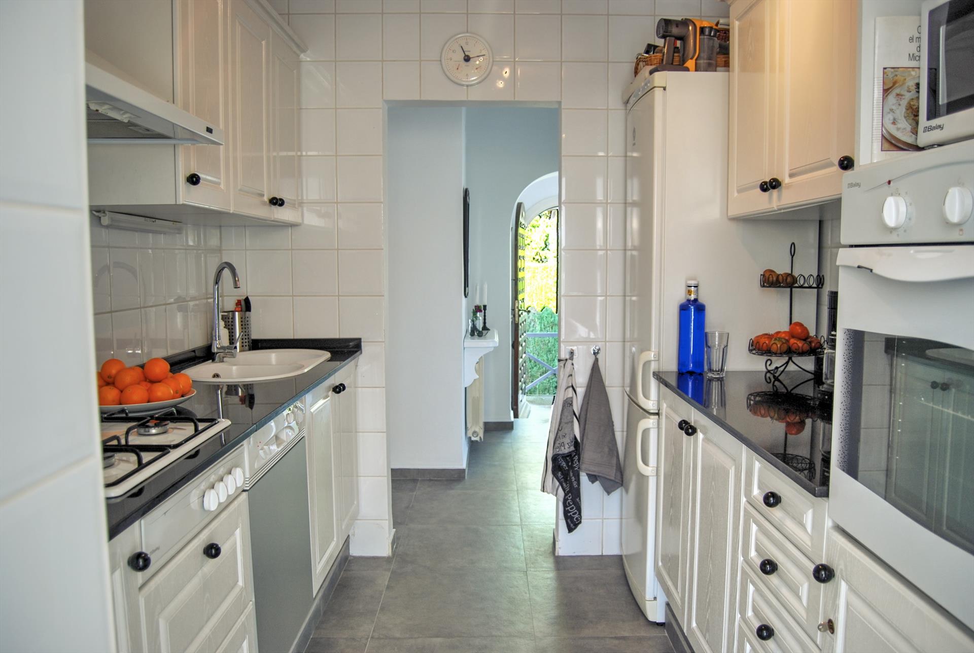 • cocina con placa de gas, horno eléctrico, microondas, lavavajillas, frigorífico-congelador, cafetera, hervidor eléctrico, batidora, tostadora y exprimidor