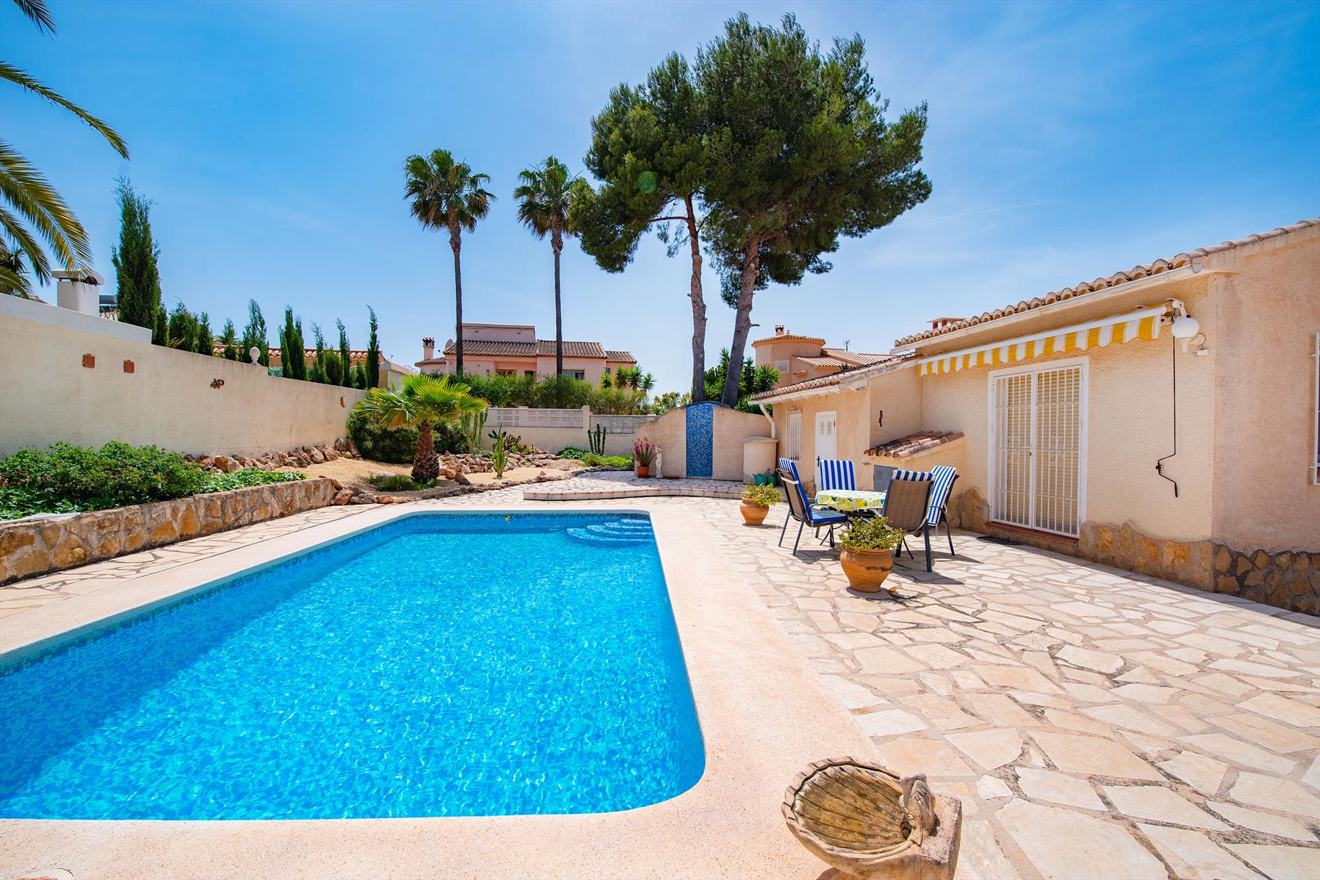 Maravillosa y cómoda villa en Benissa, Costa Blanca, España, con piscina privada para 4 personas. La casa está situada en una zona residencial de playa, a 3 km de la playa de La Fustera y a 5 km de Calpe.