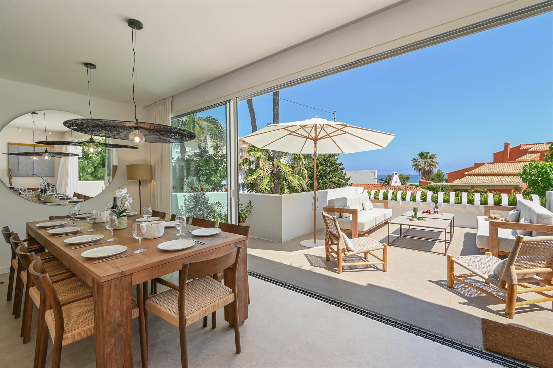 La villa de lujo cuenta con 4 dormitorios, 3 baños y 1 aseo de cortesía, distribuidos en 2 niveles. El alojamiento ofrece un hermoso jardín con césped y árboles, una bonita piscina, maravillosas vistas al mar y bellas vistas a las montañas. Su comodidad y la proximidad a la playa, lugares para ir de compras, actividades deportivas, lugares de ocio, atracciones y cultura hacen de esta una villa de lujo ideal para pasar sus vacaciones en España con familiares o amigos.