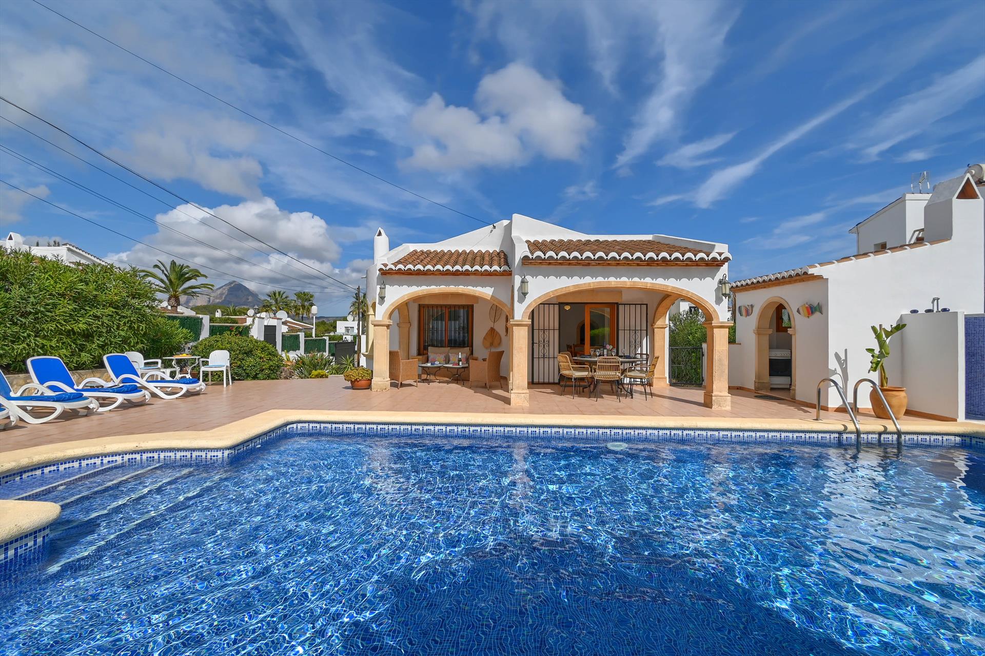 Maravillosa y cómoda villa con piscina privada en Jávea, Costa Blanca, España para 4 personas. La casa está situada en una zona residencial de playa a 3 km de la playa El Arenal, Jávea.