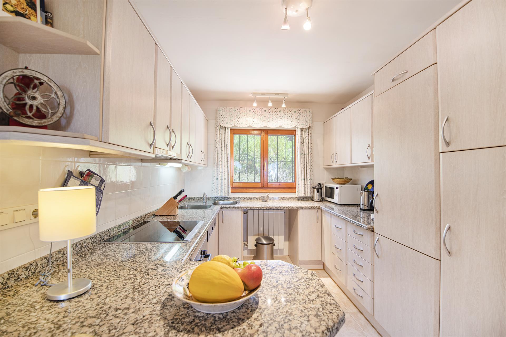 • cocina abierta con placa eléctrica, horno eléctrico, microondas, lavavajillas, frigorífico-congelador, cafetera, hervidor eléctrico y tostadora