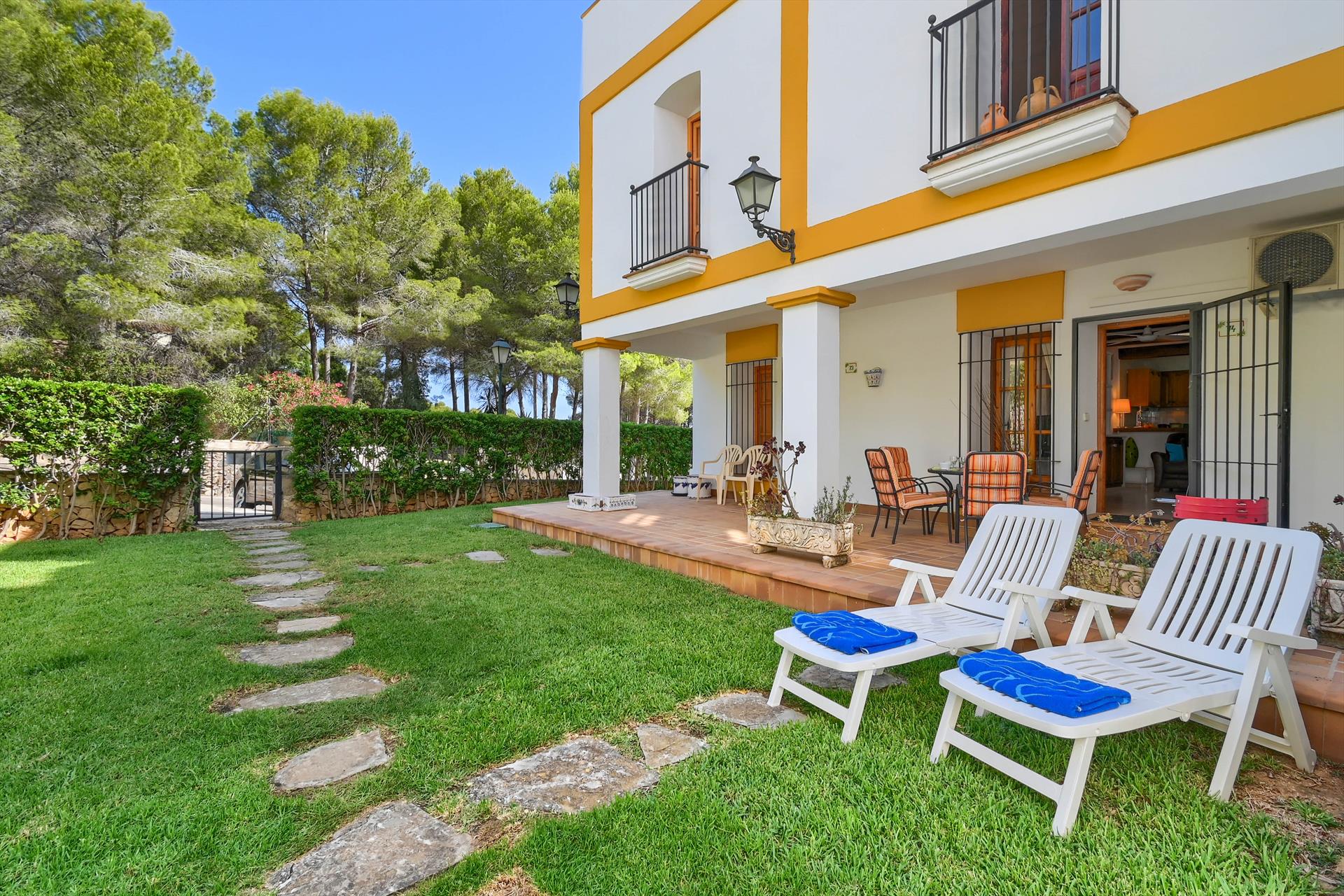 Die Wohnung verfügt über 2 Schlafzimmer, 1 Badezimmer und 1 Gästetoilette, verteilt auf 2 Ebenen. Die Unterkunft bietet einen Rasen und einen gemeinschaftlich genutzten Garten mit Bäumen. Die Nähe zu Sportaktivitäten und Ausgehmöglichkeiten macht diese Wohnung zu einer ausgezeichneten Wahl für Ihren Urlaub in Spanien mit Familie oder Freunden.