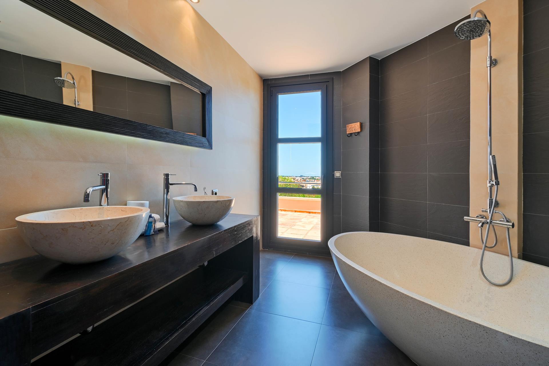 • Eigenes Badezimmer mit Doppelwaschbecken, Badewanne/Duschkombination und Toilette