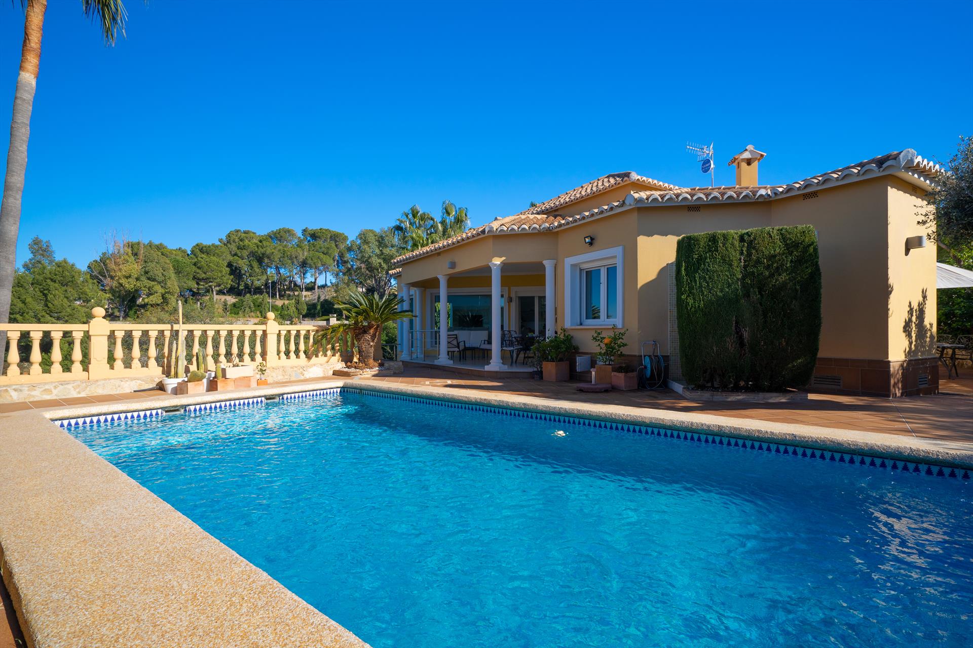 Wunderschöne und komfortable Villa in Denia, Costa Blanca, Spanien mit privatem Pool für 6 Personen. Das Haus befindet sich in einem hügeligen und Wohnstrandbereich, 1 km vom Strand Marineta Casiana und 1 km vom Mittelmeer entfernt.