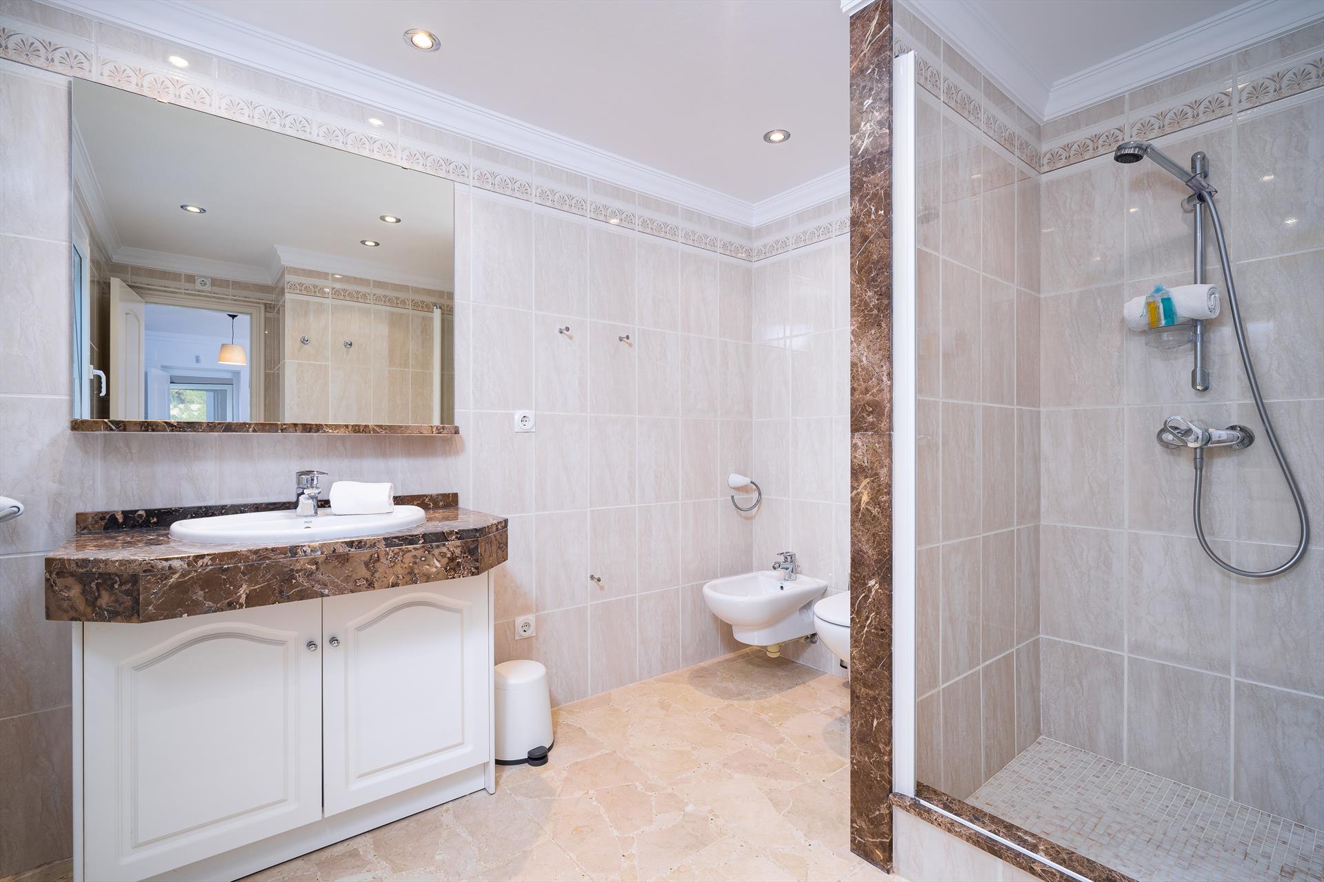 • Badezimmer mit Einzelwaschbecken, Dusche, Bidet und Toilette