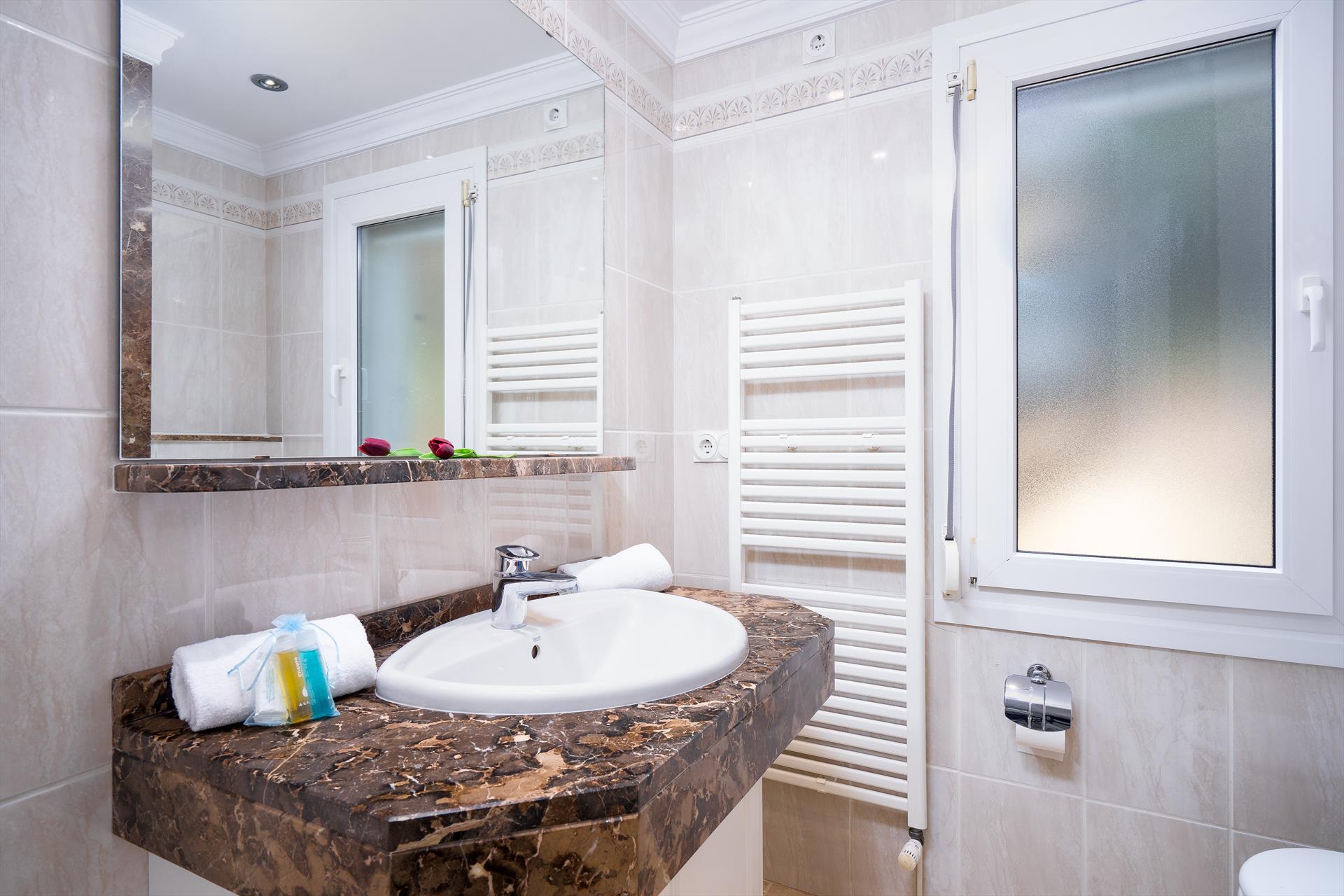 • Schlafzimmer mit Klimaanlage, Kingsize-Bett (200 x 180 cm) und en-suite Badezimmer