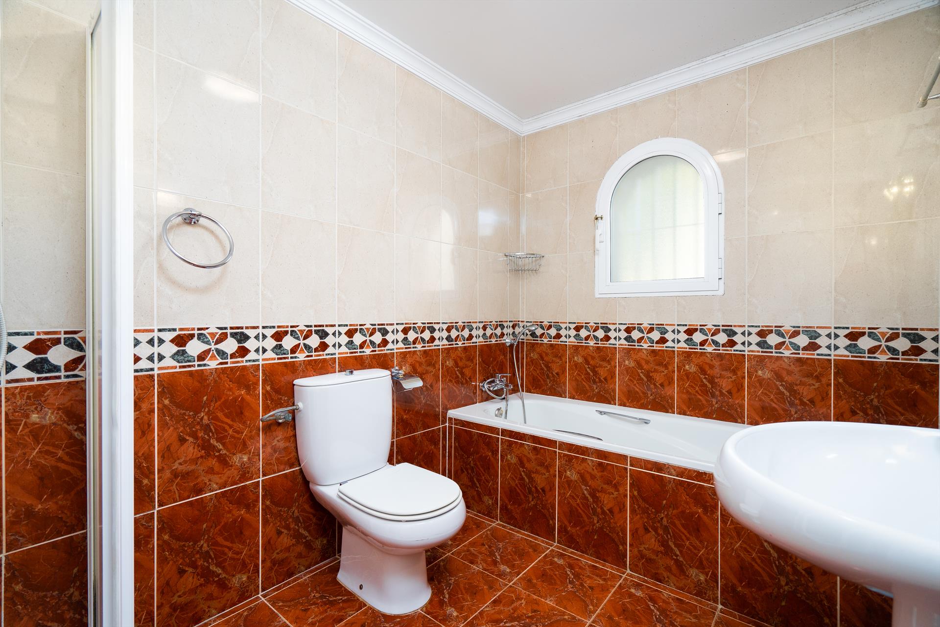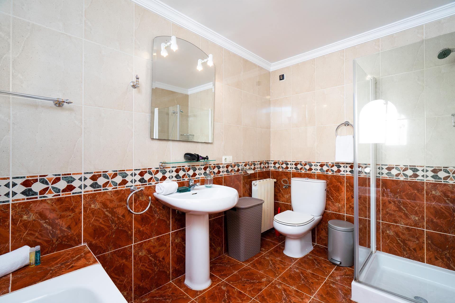 • Badezimmer mit Einzelwaschbecken, Badewanne, Dusche und WC