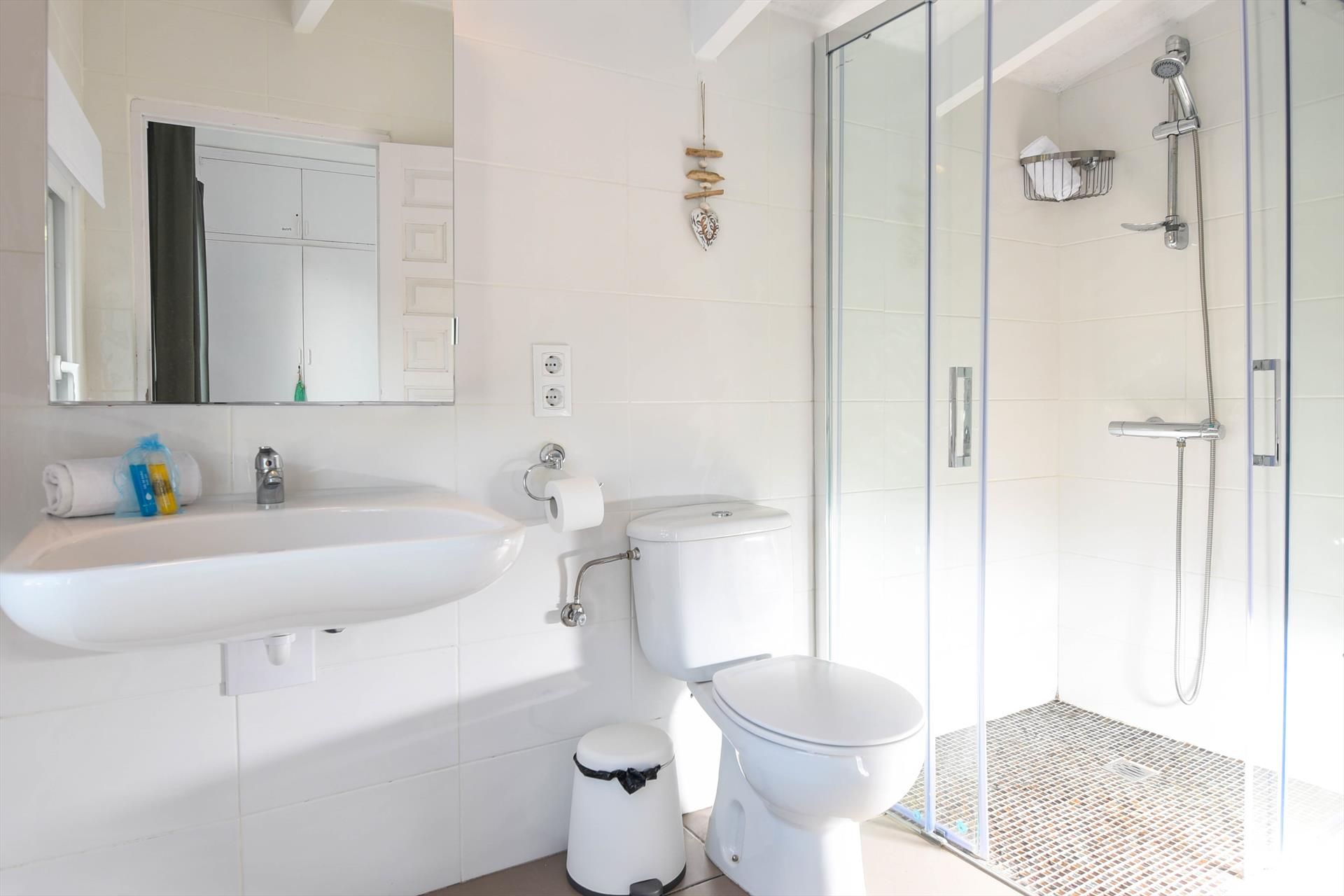 • Badezimmer mit Einzelwaschbecken, Dusche, Toilette und Föhn