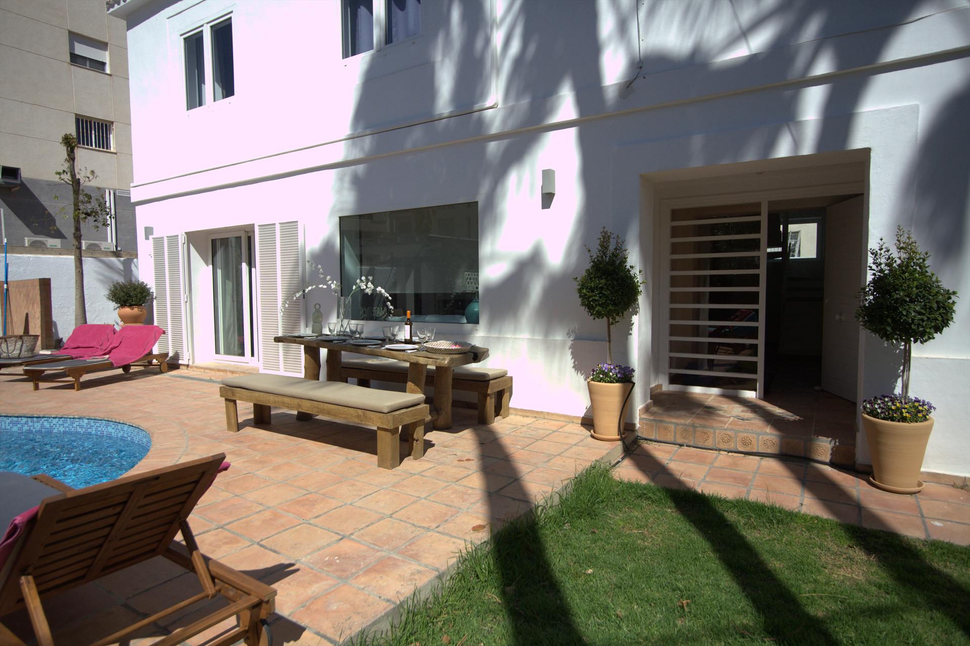 The holiday home has 4 bedrooms and 3 bathrooms, spread over 2 levels. The accommodation offers a beautiful lawned garden with trees and a lovely pool. Its comfort and the proximity to the beach, shopping venues, sports activities, entertainment facilities, nightlife, sights, and culture make this a splendid holiday home to spend your holidays in Spain with family or friends.