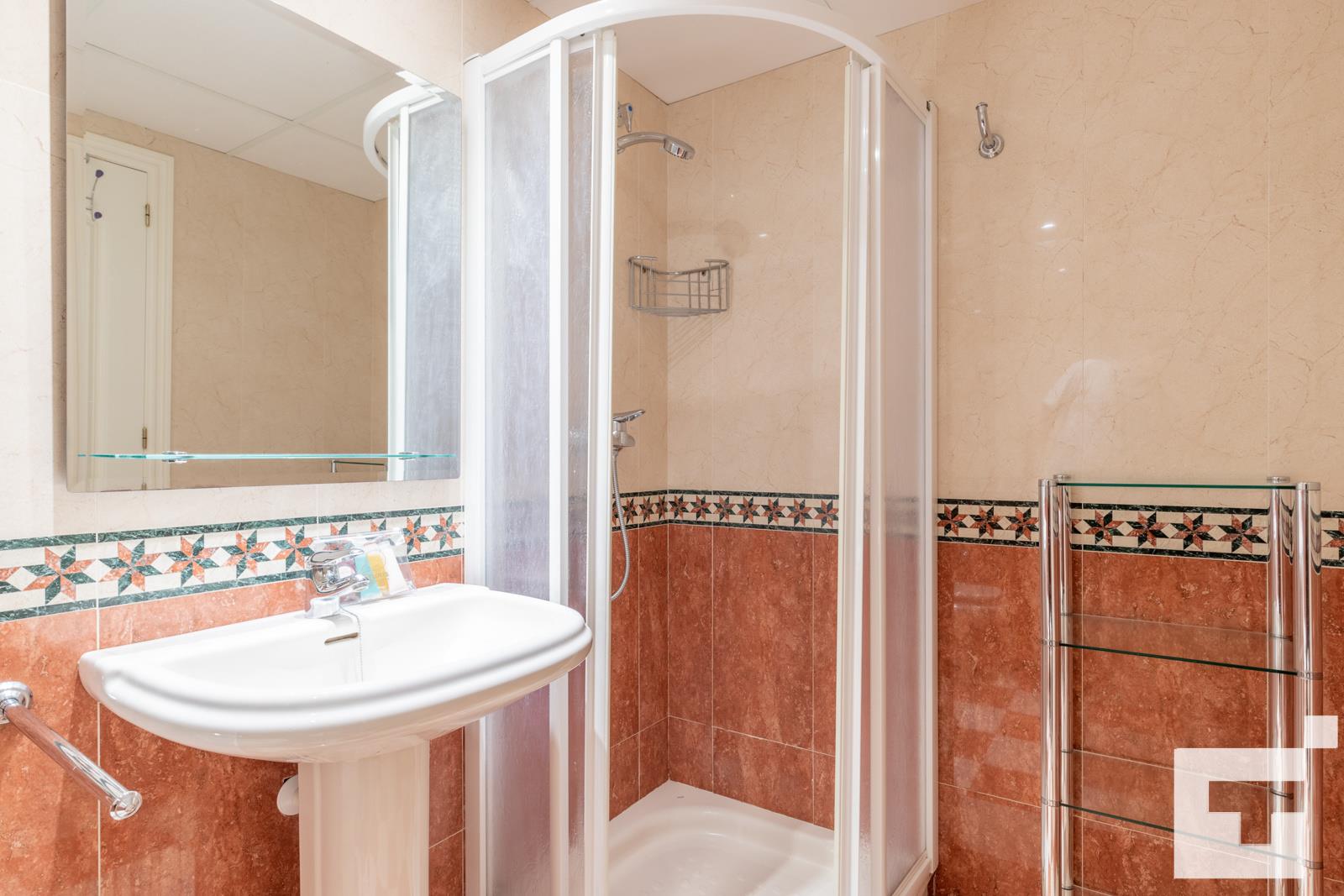 • bathroom with single washbasin, shower, and toilet