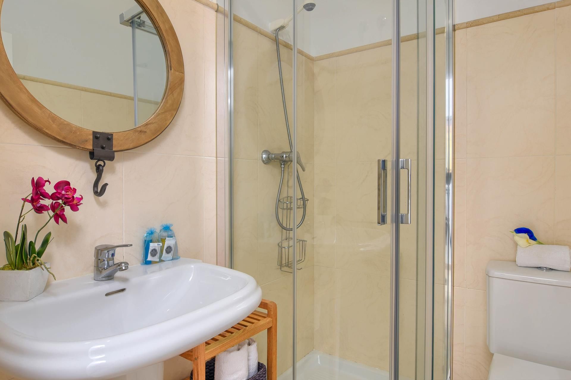 • bathroom with single washbasin, shower, and toilet