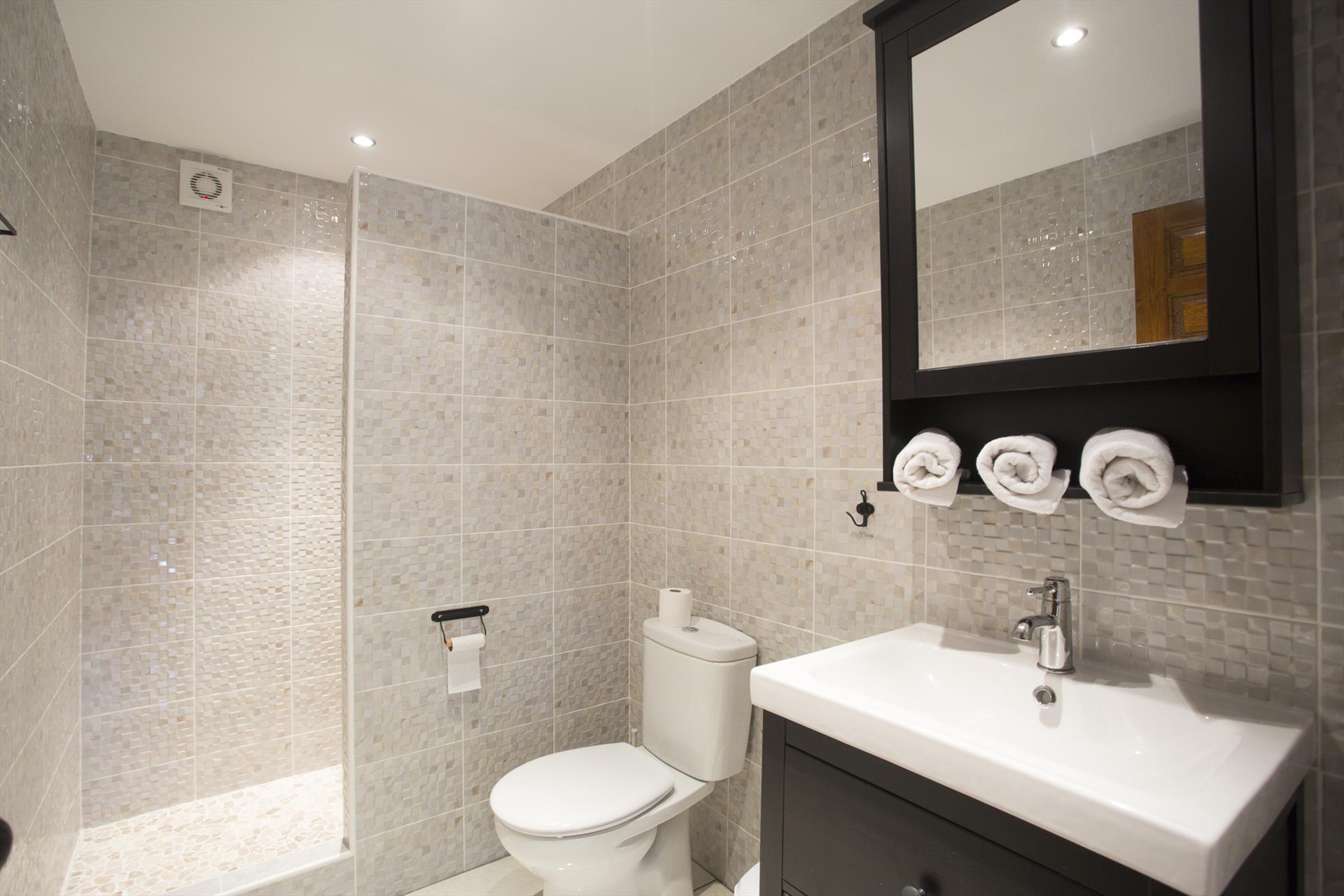 • en-suite bathroom with single washbasin, shower and toilet