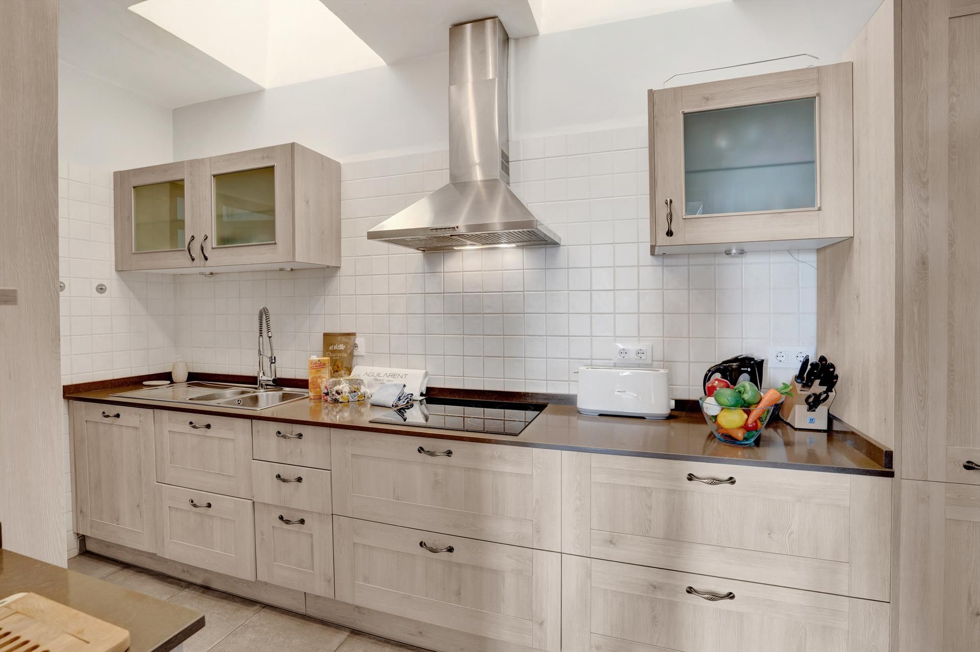 • kitchen with electric hob, electric oven, microwave, dishwasher, refrigerator-freezer, coffee machine, electric kettle, mixer, toaster, and juicer