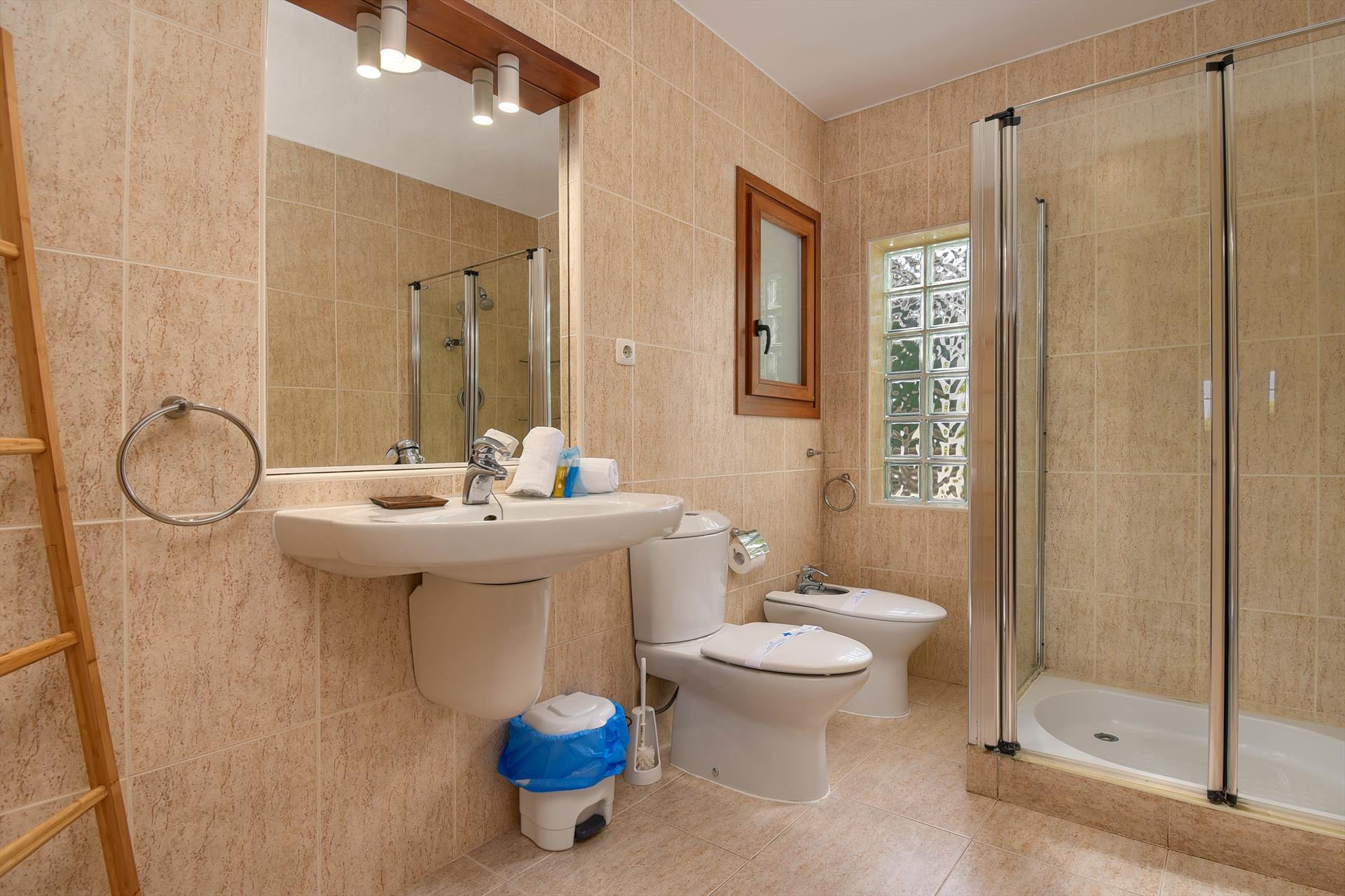 • bathroom with single washbasin, shower, bidet and toilet