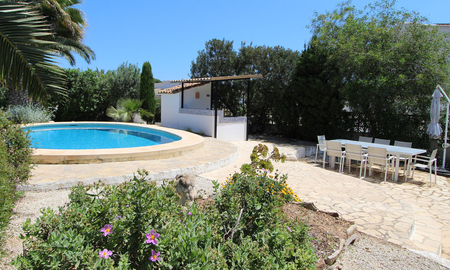 Wonderful and comfortable villa in Moraira, on the Costa Blanca, Spain with private pool for 6 persons. The house is situated in a residential area, close to restaurants and bars, shops and supermarkets and at 3 km from AMPOLLA beach.