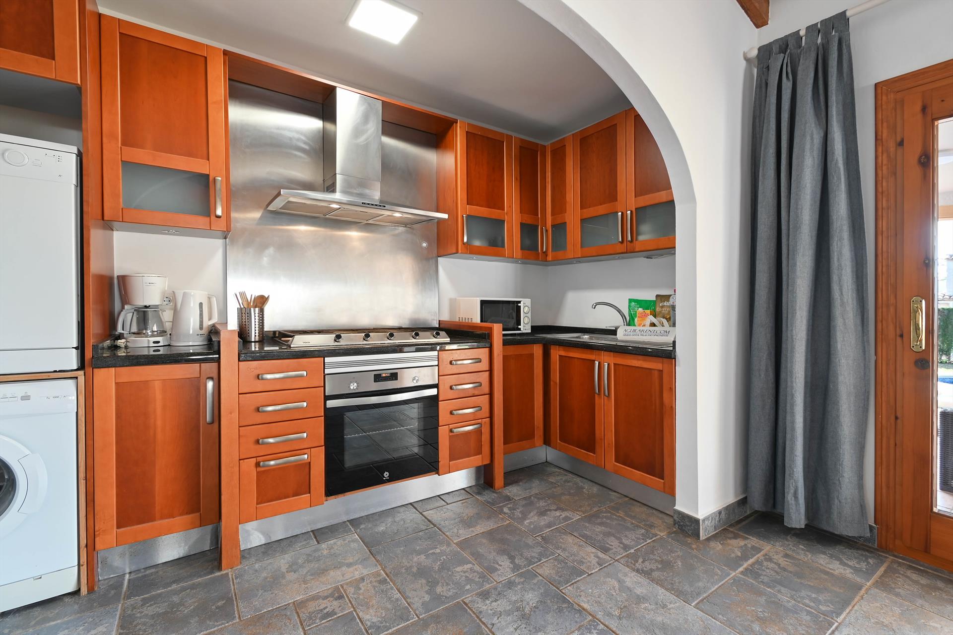 - cuisine ouverte avec plaque de cuisson au gaz, four électrique, micro-ondes, lave-vaisselle, réfrigérateur-congélateur, cafetière, bouilloire électrique, mixeur, grille-pain et extracteur de jus
