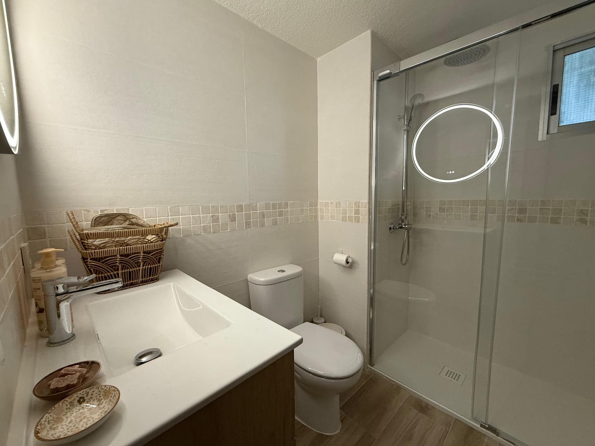 • badkamer met enkele wastafel, douche en toilet