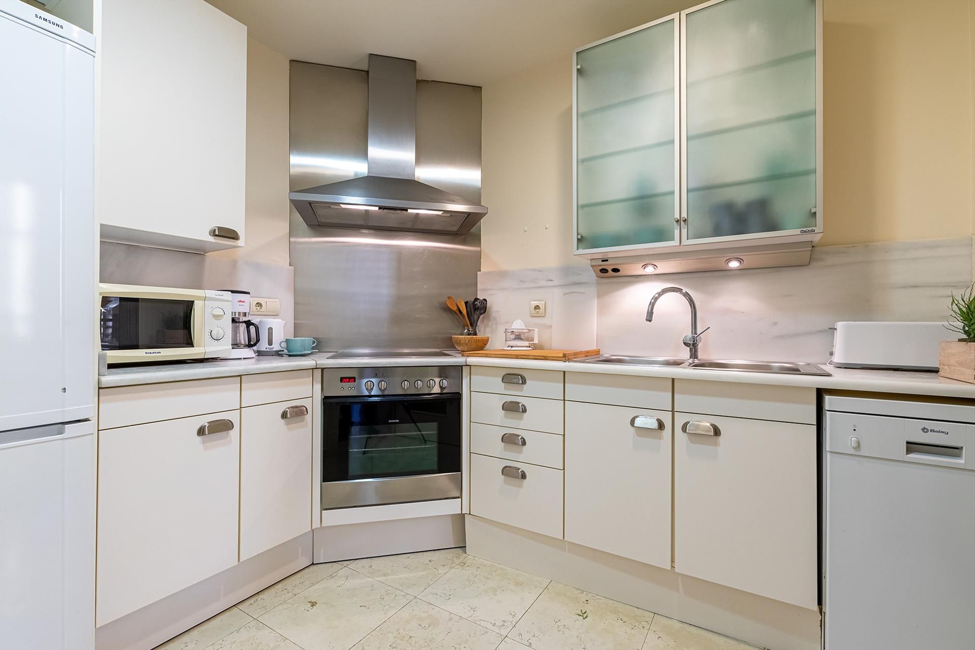 • keuken met elektrische kookplaat, elektrische oven, magnetron, vaatwasser, koelkast-vriezer, koffiezetapparaat, waterkoker, mixer, toaster, en sapcentrifuge