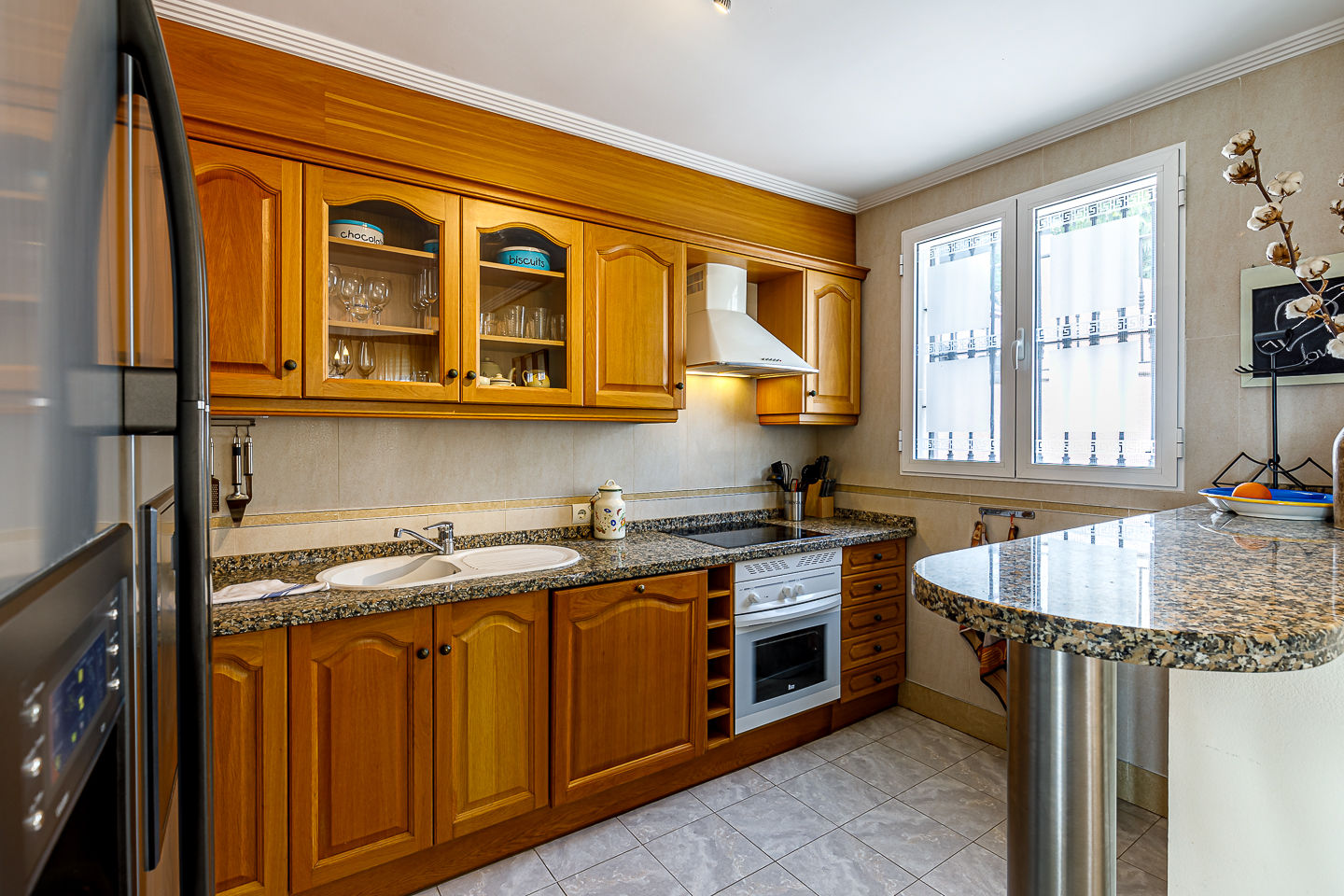 • keuken met elektrische oven, magnetron, vaatwasser, koelkast, koffiezetapparaat, waterkoker, mixer, en broodrooster