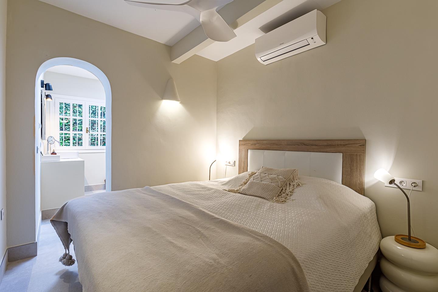• slaapkamer met kingsize bed (met een afmeting van 200 bij 180 cm), ventilator en en-suite badkamer