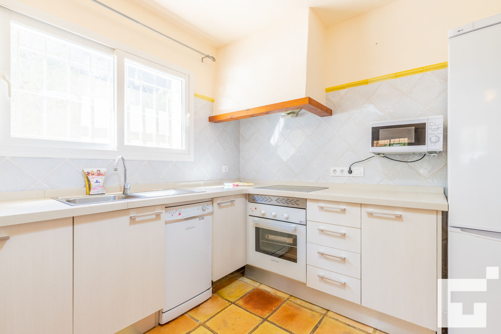 • keuken met elektrische kookplaat, elektrische oven, magnetron, vaatwasser, koelkast, diepvries, koffiezetapparaat, mixer, broodrooster en juicer