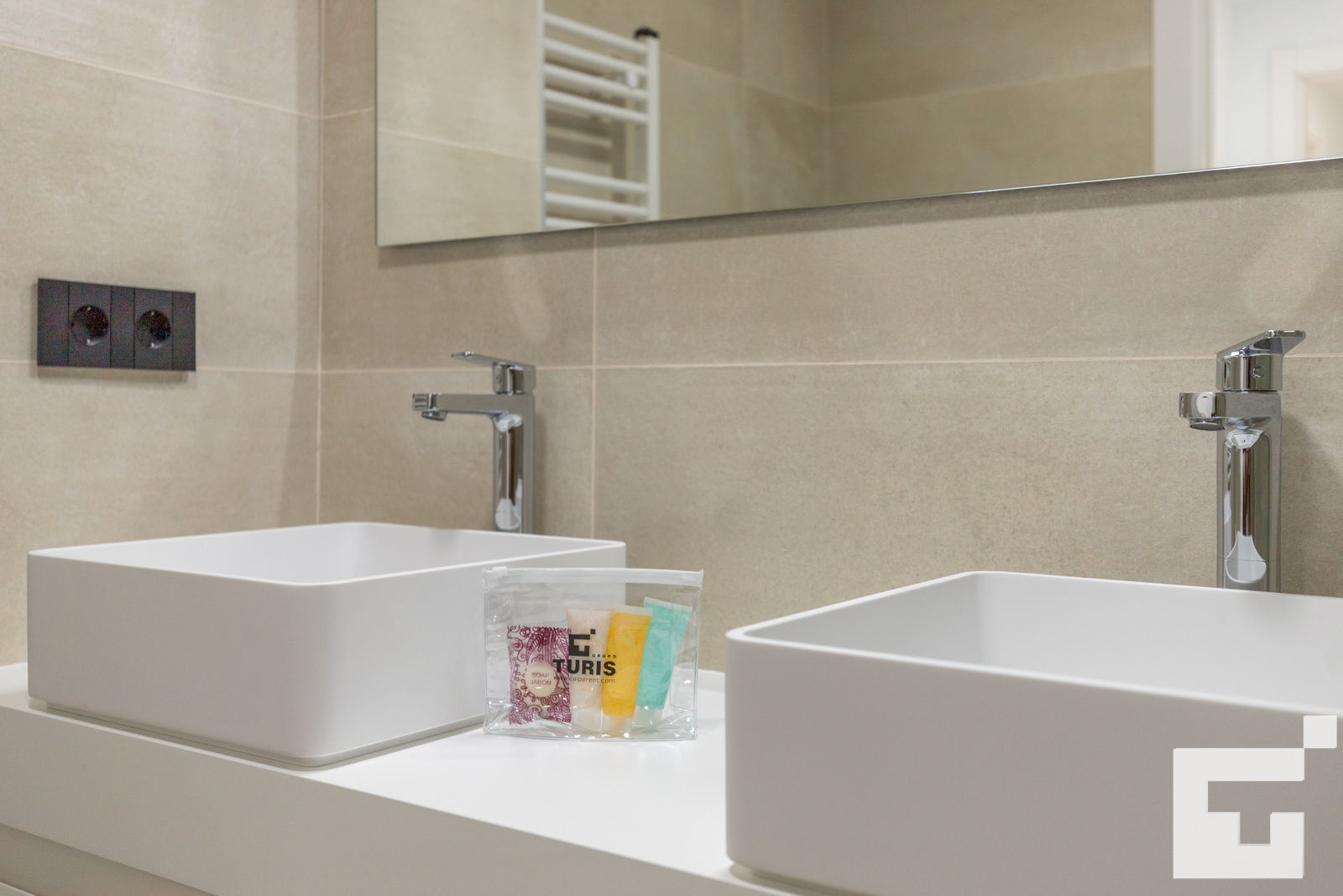 • en-suite badkamer met dubbele wastafel, douche en toilet