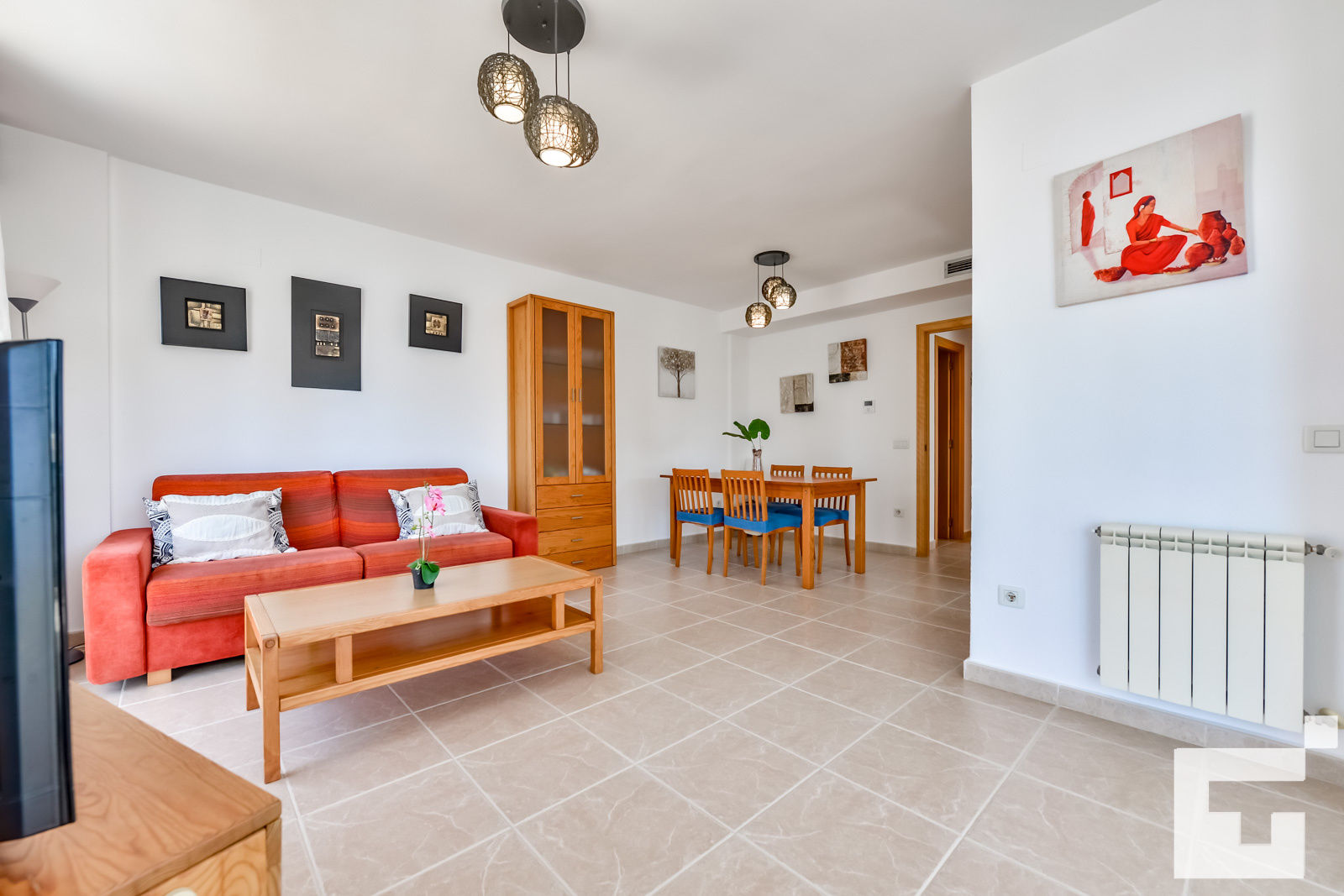 • woonkamer met airconditioning, televisie, hi-fi en slaapbank
