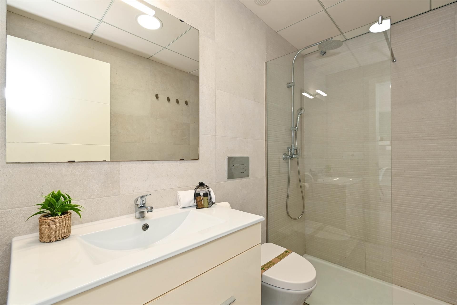 • Badkamer met enkele wastafel, douche en toilet