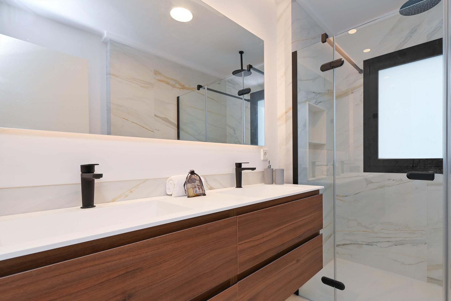 • badkamer met dubbele wastafel en douche