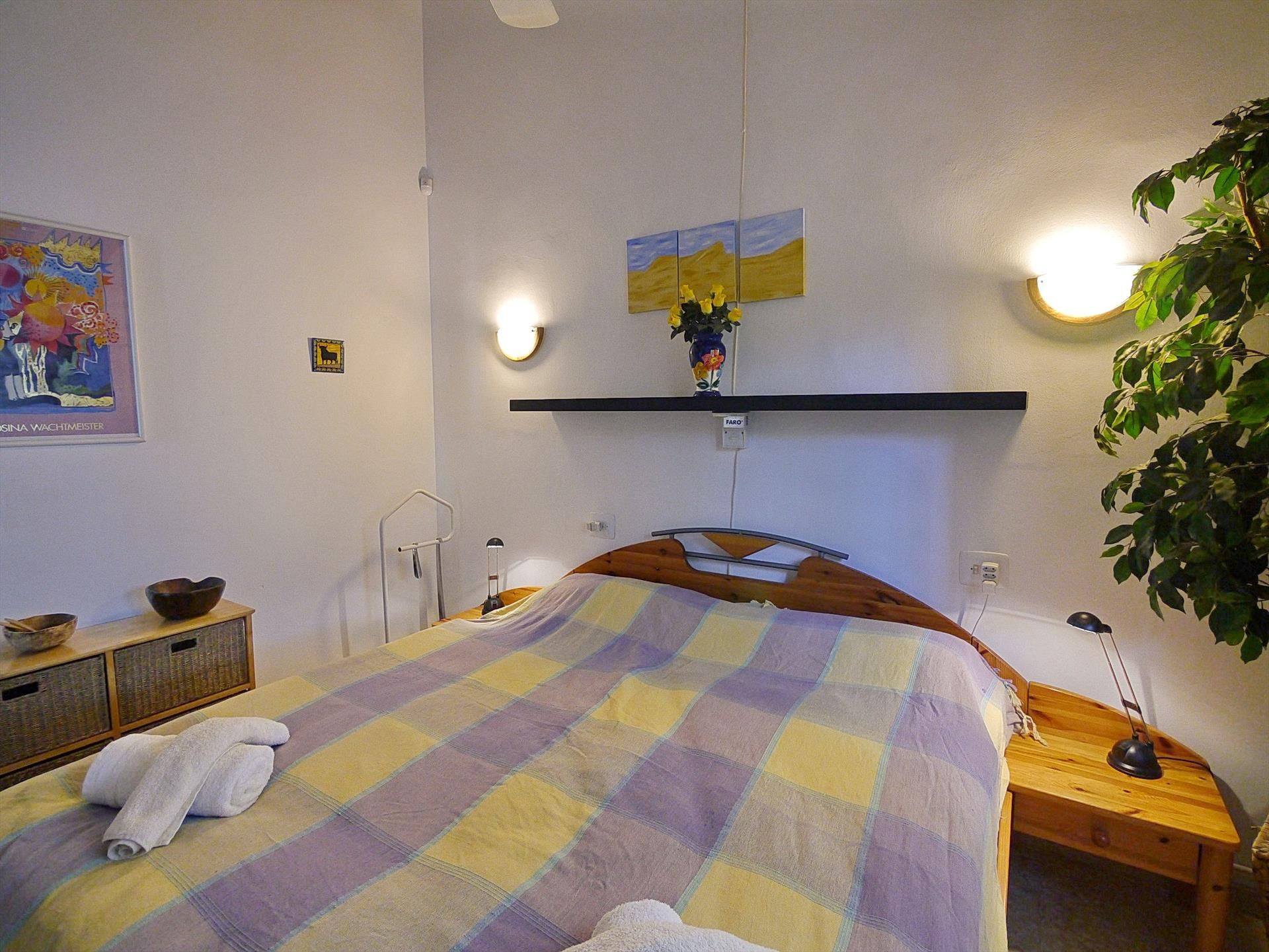 • airconditioned slaapkamer met tweepersoonsbed (200 bij 140 cm), televisie en ventilator